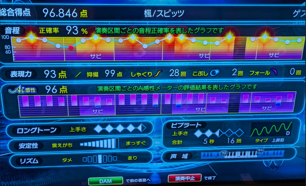 音程を100%完璧にするのは至難の業ですが、「抑揚(99点)」や「しゃくり(28回)」といった加点要素を増やすことは、コツさえ掴めば誰にでもできます。