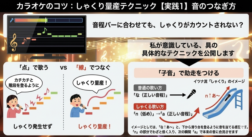 しゃくりを増やすコツは、音を「点」ではなく「線」でつなぐこと。